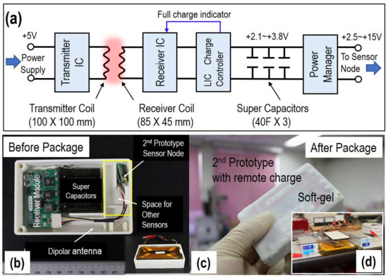 Schematic view of the wireless power transmission system, which includes a power transmitter module and power receiver module (a); photos of the second prototype sensor node with wireless power receiver module before (b) and after packaging (c); and photo of the evaluation system (d).