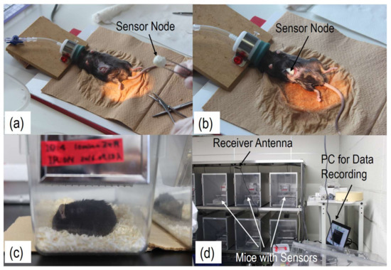 Rodents play an invaluable role in biomedical research, since approximately 95% of all laboratory animals are mice and rats. Mice have less than half of the body weight of rats and require a much lower feeding and maintenance cost than rats. However, due to the difficulties of monitoring biological information of laboratory mice in real time by using biotelemetry, roughly 50% more scientific research studies have been done on laboratory rats than on laboratory mice. By using the first prototype sensor node, as shown in Figure 1b, implant experiments were successfully carried out on laboratory mice to monitor their body temperatures.