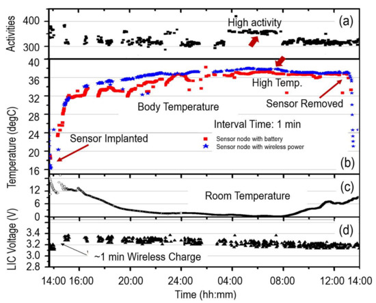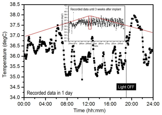 The recorded data is summarized in Figure 7 for comparison. It can be seen that the sensor had stabilized only a few hours after implantation. The body temperature shown in Figure 7b,c reveals that the sensor node that uses a battery as power supply and faces toward the outside of the body, is more influenced by room temperature than the sensor facing toward the inside of the body. However, temperature variation is quite limited compared to that of the laboratory mice. Even though the measured body temperature showed sufficiently high accuracy, the relationship between activities and the body temperature of the cow was hardly recognized. These results and phenomena reveal the effects of the differing physical constitutions to different animals.