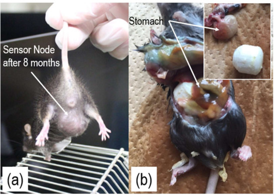 As shown in Figure 5, some mice survived for more than eight months after the implantation, while a few were dead a couple of days after the implantation. In general, gel has poor water permeability resistance. Figure 5a clearly indicates that water permeability resistance was improved after using both the PLA case and gel, since no clear deuteriation was found even after eight months. However, further evaluation is necessary if we are to expect a few years of implantation. As shown in Figure 5b, the results of dissection suggest that the cause of death was intestinal obstruction. In addition to selecting a suitable location for implantation, further scale-down of both size and weight of the sensor nodes, especially the antenna module, may help reduce the life-risk of the mouse during experiments. Among state-of-the-art technologies, stacked antennas or printed antennas would be potential candidates if efficiency and bandwidth could be improved [24].