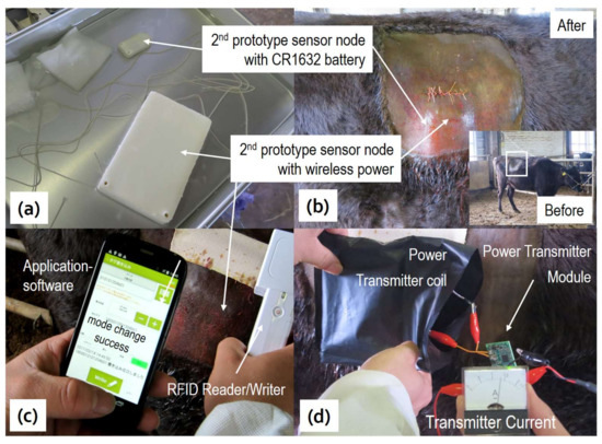 Japanese cow, which is also called wagyu, is raised in a luxurious fashion with specifically tailored diets and lifestyles. Therefore, real-time and long-term monitoring of their health conditions, as well as their daily activities, is essential to ensuring quality of beef, as well as to reducing the risk of sudden death [25]. As shown in Figure 6a,b, sensor nodes with battery power supplies (as shown in Figure 1d) and wireless power modules (as shown in Figure 2c) were implanted under the skin of a wagyu at a location close to the rumen to evaluate their performances, as well as to investigate the effects of rumen movement.