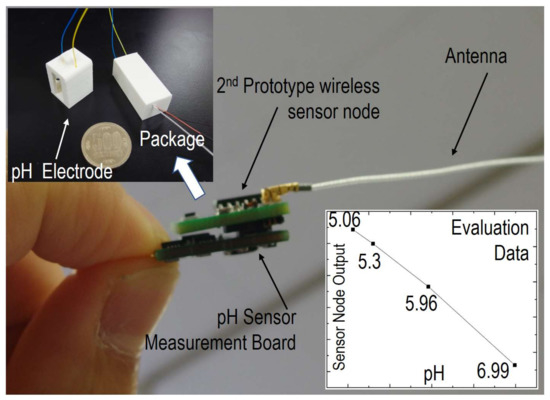 To improve the quality of beef, another essential biological data point is the rumen pH value. In our previous work, a fully solid-type pH sensor was developed to monitor gastric acid in rumen in real time [15]. Figure 8 shows a photo of the miniaturized wireless pH sensor assembled with the second prototype sensor node. The on-board temperature sensor can be used to calibrate the sensor for dealing with temperature drift, and the on-board accelerometer is useful for simultaneously recording rumen motility. The results in the inset of Figure 8 clearly demonstrate the high accuracy and good linearity of the measured pH value. Further development, especially on system integration and packaging with the second prototype sensor node, is ongoing for the long-term monitoring of reflux in the esophagus of aged people.