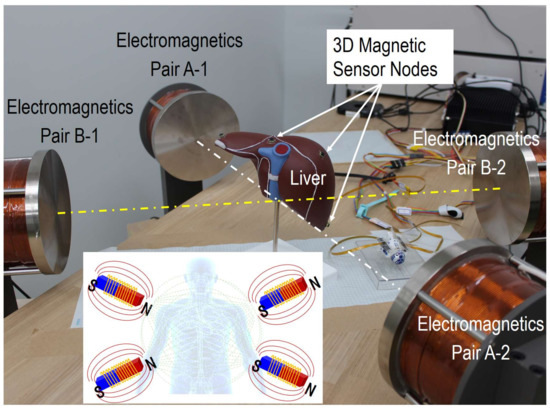 As a further application of implantable devices, a 3D magnetic sensor was included in the sensor node and then attached to organs or surgical instruments, where an artificial magnetic field was created with a unique strength or direction for each location. Figure 9 shows a photo of our developed system for the feasibility study, and the inset shows its mechanism. The strength of the magnetic field was designed to be between 1 mT and 30 mT, with a total volume of 60 × 60 × 60 cm3, and the sensitivity of the 3D magnetic sensor was 1.1 μT. Several pairs of electromagnetics with fixed driving frequencies from DC to a few Hz were designed to recognize the individual magnetic fields generated by each pair and location, while the rotation of the sensor nodes can also be calculated, even at a low sampling rate of a few tens of Hz, to reduce its power consumption. Preliminary results suggest that a positioning accuracy of 3–5 mm can be achieved based on the raw data from the sensors, and can then be improved to 2–3 mm after using the digital filter. The location data of each sensor will be imported into 3D simulated human liver models to upgrade the system from simulation to navigation for MedTech innovations.