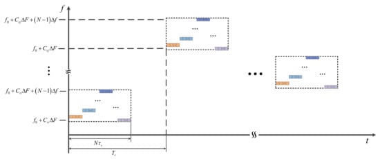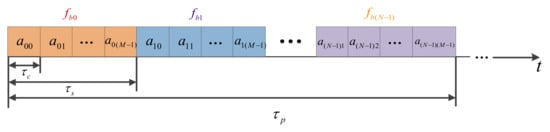 where is the CFSK/PSK subpulse of the stepped frequency; is the carrier frequency of the subpulse, is the starting stepped frequency, is the chaotic coded sequence, is the stepped frequency in CSF, and is the pulse repetition time (PRT). The same matching coherent frame has the same subpulse . To enhance the waveform agility and anti-interference ability, various coherent process intervals (CPIs) can follow the disparate parameters, including , and . The structure block diagram of CSF-CFSK/PSK signal is shown in Figure 2. The time–frequency block diagram is shown in Figure 3.