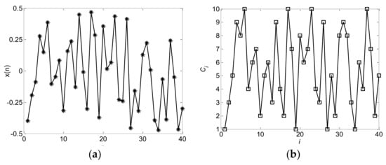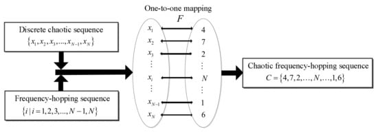 Figure 4 presents the block diagram of chaotic frequency-hopping sequence generation. The challenge lies in the selection of the chaotic mapping and one-to-one mapping between the discrete chaotic sequence and the frequency-hopping sequence [29]. Different chaotic sequences result in substantial differences in performance in terms of the autocorrelation and the ambiguity function. Therefore, the corresponding chaotic sequences must be selected according to the signal performance requirements. The preferred method of chaotic frequency-hopping sequence generation is to quantify the discrete chaotic mapping trajectory and optimize the quantization threshold, as previously described [34]. These methods must construct the corresponding quantitative criterion according to the various chaotic trajectory characteristics. Because the quantization precision is limited, certain frequency-hopping sequences may fall into the same quantized interval, thereby worsening the coherent processing results. A previous report [35] presented a one-to-one mapping method using queuing theory. In that study, the mapping method was used to generate chaotic frequency-hopping sequences. We use the same method and equate chaotic frequency-hopping sequences with CFSK codes in this study. The mapping method is described as follows: