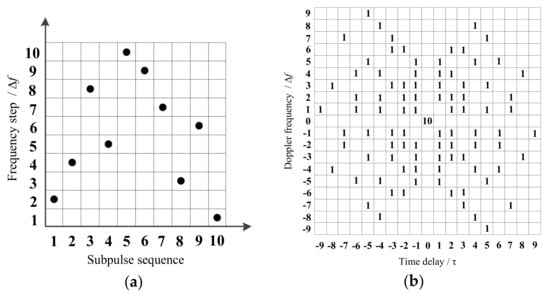 Low probability of intercept (LPI) is important for modern radar survival [1,2,3]. The LPI radar typically uses a frequency shift keying (FSK) or phase shift keying (PSK) modulation signal. The PSK signal has the advantages of waveform agility and excellent anti-jamming capability, but suffers from Doppler mismatch problems [4]. The FSK signal can easily achieve a large bandwidth and larger main lobe-to-peak-sidelobe ratio [5]. The most important limitation is that single FSK or PSK modulation step cannot attain a large time–bandwidth product [6,7], thereby limiting the anti-intercept ability of the LPI radar. FSK and PSK composited coded modulation can obtain large time–bandwidth products, achieve complementary advantage between the single-modulation methods, and improve the range resolution and velocity resolution [8,9,10]. FSK/PSK composited coded modulation can significantly improve the LPI performance of radar [11,12].