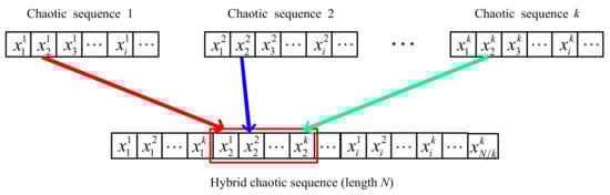 Chaotic mapping is sensitive to the initial value, and by changing the initial value, completely different and infinite non-repetitive frequency-hopping sequences can be obtained. By contrast, the chaotic frequency-hopping sequence has the possibility of being predicted. To increase the prediction challenge of the interceptor, two or more discrete chaotic sequences with better performance can be combined to increase the complexity of the sequences, enhance the coding performance [37] and greatly reducing the possibility of prediction. Many methods of obtaining hybrid chaotic sequences are available. In this study, 2 elements from the modified Bernoulli and the modified skew tent sequence are extracted in turn to produce new codes [37]. The block diagram of the hybrid chaotic frequency-hopping sequence generation is shown in Figure 7. The hybrid discrete chaotic mapping trajectory and hybrid chaotic frequency-hopping sequences generated via the modified Bernoulli and modified skew tent are shown in Figure 8. The composited frequency-hopping sequence accurately preserves the characteristics of the hybrid trajectory.