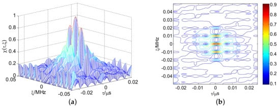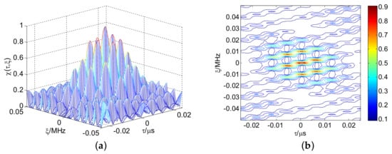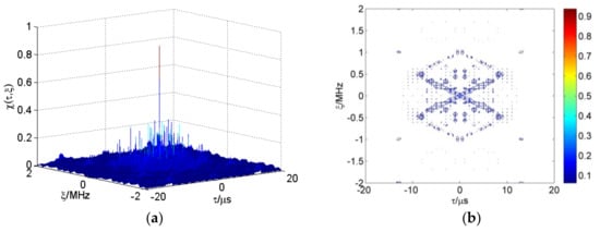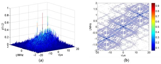 According to reference [38], the first term of Equation (8) is the autocorrelation element of the CFSK/PSK ambiguity function. The second term is the cross-correlation element. We calculate the average ambiguity function of multiple frame sequences based on Equations (4) and (8). The linear frequency shift keying (LFSK)/PSK ambiguity function is shown in Figure 9a. All FSK adopt 13 Baker binary PSK codes in these figures, with . The length of FSK codes is 10, and . Range–Doppler coupling peaks can be observed on the skew ridge in Figure 9b. The CFSK/PSK average ambiguity function is shown in Figure 10; and this ambiguity function is approximately equal to the ideal thumbtack. Of course, the sidelobe level of CFSK/PSK is still relatively high because of the higher sidelobe level of the Baker binary codes.