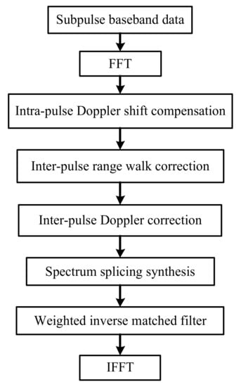 The spectrum splicing algorithm moves multiple narrowband pulse signals in the frequency domain to synthesize a wideband spectrum and uses weighted inverse matched filtering to achieve a high-resolution range profile [40,41,42]. A schematic diagram of spectrum splicing algorithm for the CSF-CFSK/PSK signal is shown in Figure 15. The algorithm is as follows.