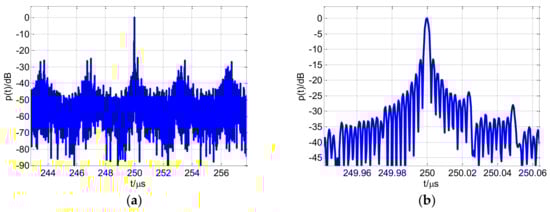 The synthesized wideband high-resolution range profile is shown in Figure 17. The profile in Figure 17a has grating lobes with a period of approximately , and the amplitude of the grating lobes is lower than that of the main lobe. The period and amplitude of these grating lobes exactly correspond to the CSF-CFSK/PSK range average ambiguity function, but are consistent with Equation (25), which is primarily because the actual target echo frequency spectrum is not the ideal rectangle after performing compensation, corrections, and weighted inverse matched filtering. However, as shown in Figure 18, the weighted inverse matched filtering can significantly reduce the grating lobes level around the main lobe. The period of these grating lobes is . Figure 17b shows the main lobe of the high-resolution range profile.