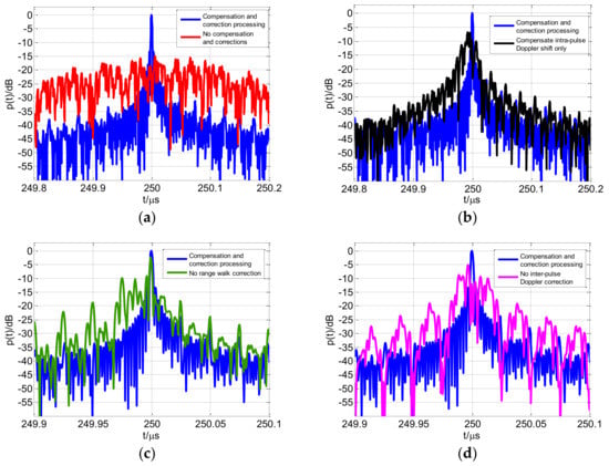 Processing results of various compensation and correction conditions (a) no compensation and corrections; (b) compensation for intra-pulse Doppler shift only; (c) no range walk correction; (d) no inter-pulse Doppler correction.