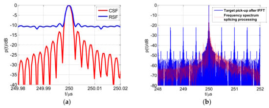 where and are the minimum and maximum frequencies in the effective synthesized bandwidth, respectively; and is obtained by coherent superposition of the reference subpulse spectrum and is given by Equation (23). Note that is no longer a simple complex conjugate of the reference signal spectrum; specifically, is weighted by [42].