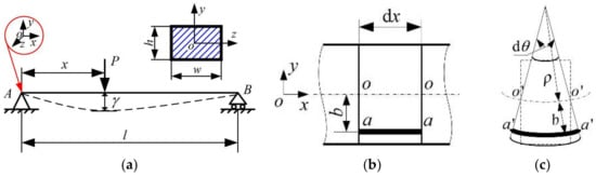 According to the Euler–Bernoulli assumptions, the following geometrical relationships of a microsegment of beam dx exist before deformation (Figure 1b) and after deformation (Figure 1c):
