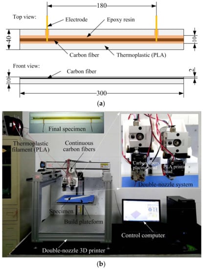 The specimen was designed and fabricated as shown in Figure 2. The carbon fiber was the T300B-3000-40B Torayca™ and the thermoplastic was polylactic acid (PLA). The specimen was 300 mm long, 40 mm wide, and 10 mm thick, and one carbon fiber tow (including 3000 filaments with a 7.0 μm diameter in each filament) was located 2 mm above the tension surface, as shown in Figure 2a. The specimen was fabricated using a self-developed double-nozzle 3D printer, as shown in Figure 2b. The PLA matrix was printed using the PLA printing head, and the carbon fiber tow was placed using the carbon fiber printing head after the PLA matrix printing finish. Trichloromethane was used to remove the PLA material on the carbon fibers at the positions where the electrodes were placed. Then, the copper electrodes were connected to the carbon fibers and bonded with conductive silver adhesives. Finally, an epoxy resin DY-E44 was used to stabilize the printed carbon fibers and the electrodes, along with the PLA matrix. The specimen cast with epoxy resin was cured at room temperature for 24 h. A total of three specimens were fabricated and tested.