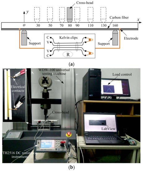 Although various studies have applied continuous carbon fibers as sensing agents for condition monitoring, the sensing behavior of continuous carbon fibers in terms of different loading positions still lacks adequate research. Most reported studies on the electromechanical behavior of carbon fiber composites under flexure are three- or four-point bending tests, where the load is applied at the geometric center of the structures. However, in practical monitoring applications, the external loading is likely to be applied in any position of the structure, rather than at the geometric center. It is also well-known that the load at different loading positions can lead to different stress on the same structure, which means that the capability of load bearing is closely related to loading positions. In this case, it is meaningful to monitor the loads at different loading positions because it is important for the external loading history to be recorded prior to the occurrence of damage and deterioration.