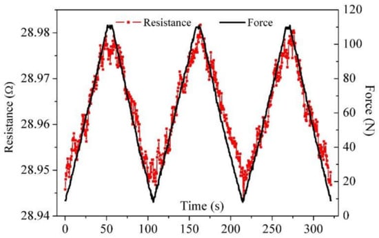 Figure 4 shows the electrical resistance and force obtained during the cyclic loading process at a loading position of 80 mm. The electrical resistance increases linearly upon loading and decreases linearly after unloading, although accompanied by some noise. The main reason for the noise is that the contact quality between the clips and electrodes is susceptible to external disturbances during the loading process. The hysteretic effect also exists in the unloading process, and this is most obvious in the second cycle. The electrical resistance response in terms of the external load is generally consistent and repeatable, which indicates a stabilization in carbon fiber sensing agents embedded in the 3D-printed polymer structures. Compared with our previous work [], the fluctuation component in the measured electrical resistance was significantly reduced due to the carbon fibers being placed automatically using the double-nozzle 3D printer instead of in a manual manner. The result also further demonstrates that 3D printing technology can be used to produce smart carbon-fiber-reinforced polymer structures with self-sensing functions.