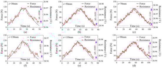 Figure 5 gives similar results for another six loading positions in the first loading cycle. It also reveals a clear correlation between the electrical resistance and the external load, but this relationship becomes weakened with the loading positions moving farther away from the central point (x = 80 mm). A smaller increase in electrical resistance at loading positions away from the central point due to low strain is induced by the same magnitude load at farther loading positions. The biggest increase of 0.04 Ω at the loading position x = 70 mm was observed, while the smallest increase of 0.029 Ω at the loading position of x = 130 mm. The similarity between the electrical resistance and the external force at different loading positions in the experiments indicates that the continuous carbon fiber can be used as a self-sensing agent for external load monitoring at different loading positions.
