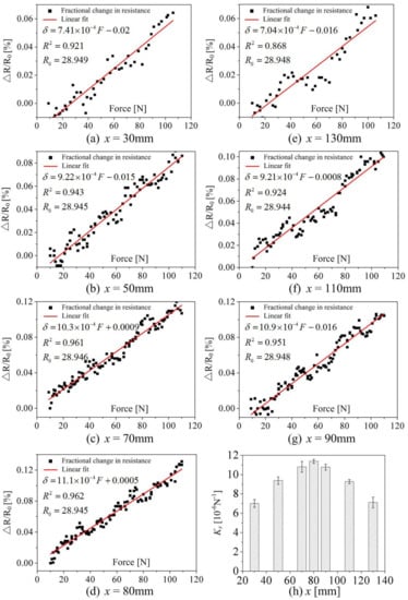 The sensitivity coefficient Kx for each loading cycle at different loading positions can be evaluated according to the linear fitting results of the detected response. Figure 6a–g gives the linear fit of the fractional change in resistance versus force at different loading positions. It can be seen that there is a strong linear relationship between the fractional change in resistance and the force at each loading position. All values of R-squared (R2), which refers to the goodness of fit and describes how well the linear model fits the set of testing data here, are >0.92, except the position x = 130 mm (R2 = 1, which means a perfect fit). Figure 7h summarizes the average sensitivity coefficient Kx and standard deviation of linear fitting results at different loading positions for three loading cycles. The average sensitivity coefficient Kx was strongly dependent on the loading position, which ranged from 7.01 to 11.37 at different loading positions throughout the three loading cycles, with a maximum standard deviation of 0.56 at the loading position x = 70 mm and a minimum standard deviation of 0.21 at the loading position x = 80 mm.