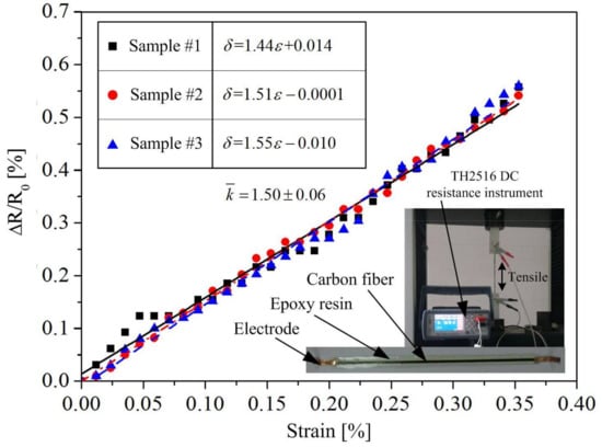 To calculate the sensitivity coefficient Kx, the strain sensitivity k of carbon fiber tow used in this study was measured under the tensile test. The length of the carbon fiber tow was 180 mm, which was coated with a DY-E44 epoxy resin. The final dimensions of the specimen were 180 mm long, 10 mm width, and 2 mm thickness. The loading speed was 2 mm/min. Three samples were used during the tensile tests. The results are shown in Figure 7, and the average measured strain sensitivity k is 1.50, with a standard deviation of 0.06.