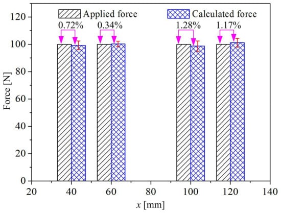 Figure 8 gives out the comparison of sensitivity coefficient Kx between measured values (listed in Table 1) and calculated values (according to Equation 16). It can be seen that the calculated values are mostly consistent with the measured values, which indicates the feasibility of the presented approach in this study. Thus, the external load at different loading positions on the continuous carbon-fiber-embedded polymer beam can be calculated using Equation (17), when the fractional change in electrical resistance is measured:
