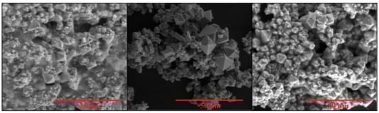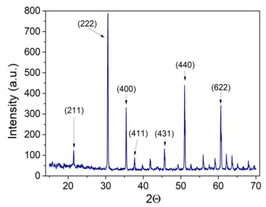 All the peaks found in the spectrum correspond to each one of the faces displayed by the material with lower or higher intensity, fitting with the corresponding JCPDS card no. 01-071-2194. The most representative peaks appear labelled in Figure 2. None of the peaks present could be attributed to impurities, confirming the purity of the material synthesized []. The results of the XRD analysis for the sample synthesized at 500 °C match those reported previously for In2O3 octahedra synthesized at 1000 °C via the VPT method [], which indicates that the crystalline quality of the samples discussed in this paper is very similar to the one reported before.