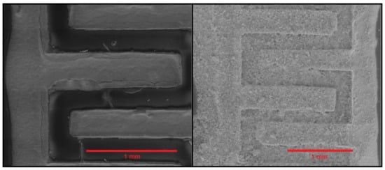 Low-magnification E-SEM images of the electrode area of a chemoresistive sensor employing a Kapton substrate. (left) The substrate before coating. (right) The same substrate after being coated with a dropped indium oxide gas sensitive film.