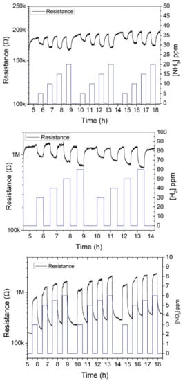 In2O3 behaves as an n-type semiconductor and sensor resistance decreases for reducing species such as NH3 or H2 and increase for oxidizing species like NO2. Each cycle of increasing concentration pulses is repeated at least two times for each panel in Figure 4. The responses are highly reproducible. Some baseline drift is present that is especially visible for NO2. This is due to the strong interaction of this oxidizing species with the gas sensitive film—which combined to the relatively low operating temperature of the sensor (i.e., 150 °C)—does not allow for a complete desorption of adsorbed species and baseline recovery during each cleaning phase [].