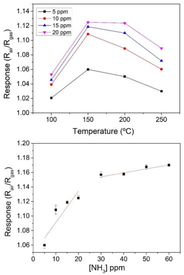 Figure 5 (upper panel) shows the effect of the operating temperature on the response to NH3. The response as a function of temperature curve shows the typical volcano shape for metal oxides []. As shown in Figure 5, the response towards NH3 is maximum when the sensor is operated at 150 °C. Elouali et al. [] reported an optimum operating temperature of 450 °C to 10 ppm concentration of NH3 with a response of 1.76 for In2O3 prepared via continuous hydrothermal flow synthesis. In [] an operating temperature of c.a. 175 °C was reported, with responses of 1.3 and 1.05 for 500 ppm and 100 ppm concentration of NH3, respectively for In2O3 thin films prepared via thermal evaporation. Our sensor showed a response of 1.12 to a 20 ppm pulse of NH3 comparing favorably with the optimum operating temperature for the sensors mentioned before.
