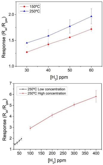 The standard deviation of H2 responses when the sensor was operated at 150 °C was lower than 5%. Meanwhile when the sensor was operated at 250 °C, the standard deviation of H2 responses increased up to 15%. The calibration curve for H2 shown in the lower panel of Figure 6 indicates that sensor response is quite linear for low H2 concentrations (up to 100 ppm). The higher concentration measured was 400 ppm of H2 and, up to this value, the sensor does not show response saturation. When operated at the optimal operating temperature of 250 °C, response and recovery times (t90) for hydrogen were 195 and 850 s, respectively.