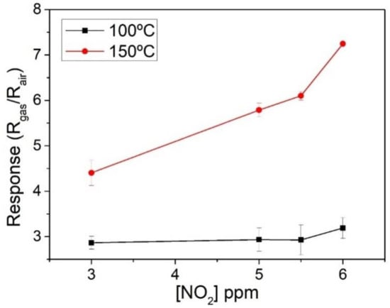 Sensors were exposed to low concentrations (3, 5, 5.5, and 6 ppm) of NO2 at two different temperatures; 100 °C and 150 °C. Figure 7 shows the response of the sensors at both temperatures, which is better at 150 °C. S. Roso et al. [] reported an optimum operating temperature of 130 °C for a high-temperature grown In2O3 (octahedral nanoparticles on top of an alumina substrate), which correlates with our results. When operated at the optimal operating temperature of 150 °C, response and recovery times (t90) for nitrogen dioxide were 105 and 785 s, respectively. These are very similar to the values reported in [].