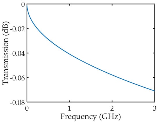 A schematic drawing of the homemade HCC is shown in Figure 1. The HCC has a solid inner conductor and an outer conductor. The dielectric layer in-between the two conductors is air. Spacers will be added to support this hollow structure (i.e., internal reflectors and connectors). The diameter of the inner conductor is designed to be 6 mm, and the outer diameter of the dielectric layer (air in between) is designed to be 14 mm. This structure design achieves an impedance of 50.8 Ω for the HCC [31]. Meanwhile, based on the design, the HCC is also capable of being connected to a commercial coaxial cable (e.g., RG-58/U) via an SMA to Type N adapter. The outer diameter of the outer conductor is designed to be 18 mm to make the HCC robust. It should be noted that the HCC is user-configurable, which could be designed to have different sizes, such as 3/7 mm or 2/4.6 mm (diameter of the inner conductor/outer diameter of the air dielectric layer), for different applications. The transmission loss of the novel HCC was numerically simulated using ANSYS HFSS. Figure 2 plots the loss of an 11.8-cm-long HCC as a function of frequency. As can be seen, the transmission loss of the novel HCC is estimated to be less than 1 dB/m for the range of 0–3 GHz, meaning that the HCC has the potential to be a new sensing platform for long-distance distributed sensing applications. Type 310S Stainless Steel is employed to fabricate the HCC for elevated-temperature applications. For extremely high-temperature environments (e.g., 1600 °C), other metals with higher melting points (e.g., niobium, molybdenum, tantalum, and tungsten) can be employed to fabricate the HCC.