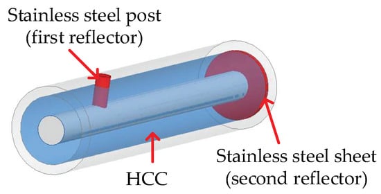 In a transmission line, there are several ways to introduce a large impedance mismatch to form a reflector with high reflectivity (e.g., >50%) to the EM wave propagating inside the waveguide, including varying the radius ratio of the inner/outer conductors, varying the dielectric materials, and shorting the inner/outer conductors. In the HCC-FPR design, a cylindrical stainless steel post, which shorts the inner and outer conductors, serves as the first highly reflective reflector; a stainless steel sheet, which also shorts the two conductors, serves as the second highly reflective reflector. The distance between the two reflectors can range from several centimeters to tens of centimeters. A schematic drawing of the developed HCC-FPR is presented in Figure 3. It should be noted that the two reflectors can be of different shapes (e.g., cubical and conical) [26].