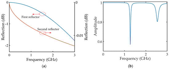 In order to numerically calculate the amplitude reflection spectrum A of the resonator using Equation (3), the reflection coefficients of the two reflectors were simulated using ANSYS HFSS. The simulation results are plotted in Figure 4a. As can be seen, both of the two reflectors have very high reflectivities in the observation bandwidth (0–3 GHz), and both of the reflectivities decrease as frequency increases. Zero dB shown in Figure 4a represents 100% reflectivity in amplitude with respect to the incident EM waves. The reflectivity of the second reflector (i.e., the stainless steel sheet) is higher than that of the first reflector (i.e., the cylindrical stainless steel post). They both drop at higher frequency regions. Setting the cavity length of the resonator to be 11.8 cm, and substituting the simulated reflection coefficients of the two reflectors and loss factor of the HCC (shown in Figure 2), the calculated amplitude reflection spectrum of the resonator in the range of 0–3 GHz is shown in Figure 4b. Two resonant dips can be clearly identified, including the fundamental resonant frequency at 1.271 GHz and the second harmonic at 2.542 GHz. The quality factors (Q-factors) of the two valleys are determined to be 36 and 25, respectively, indicating a resonant device (i.e., FPR) is developed. It should be noted that, compared with an optical fiber FPR, the stringent requirements such as high manufacturing accuracy (e.g., the surface roughness is typically 1/20 of the operation wavelength) and precise alignment, can be largely relieved in fabricating such an HCC-FPR. Integrated on a coaxial cable sensing platform, the HCC-FPR can be a good candidate for remote sensing applications in harsh high-temperature environments.
