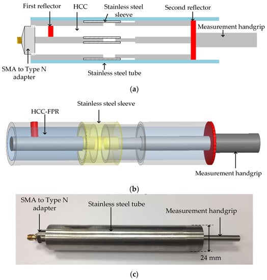 The proposed HCC-FPR-based displacement sensor. (a) A schematic drawing of the displacement sensor; (b) Three-dimensional rendering of the sensor. The outer stainless steel tube is not shown in the three-dimensional drawing; (c) A photograph of the prototype HCC-FPR-based displacement sensor. Due to the sleeve design, the right HCC part, including the second reflector will move with respect to the left HCC part when a displacement is applied to the measurement handgrip.