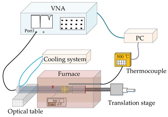 The experimental setup for high-temperature displacement measurements is schematically presented in Figure 6. A vector network analyzer (VNA, Agilent 8753ES, Santa Clara, CA USA) was used as the signal source and detector. Port 1 of the VNA was connected to the HCC-FPR-based displacement sensor through a flexible coaxial cable (RG-58/U). The flexible cable is connected to the sensor through an SMA to Type N adapter. The VNA was set with an intermediate frequency bandwidth (IFBW) of 300 Hz, 1601 sampling points, and a scanning bandwidth of 3 GHz (i.e., from 100 KHz to 3 GHz). The scattering parameter S11 (i.e., amplitude reflection spectrum) was recorded. The HCC-FPR sensor was placed in a furnace (LINDBERG BLUE M, Thermo SCIENTIFIC, Waltham, MA USA), where a thermocouple was also placed to monitor/calibrate the temperature around the HCC-FPR in real time. A personal computer (PC) was connected to the VNA through a GPIB cable to set the acquisition parameters, acquire the data, and process the data. The PC was also connected to the thermocouple to record the temperature information in real time. In the displacement measurement experiment, one end of the HCC-FPR (e.g., the end with the SMA to Type N adapter) was mounted on an optical table, and the other end (i.e., the end with the measurement handgrip) was positioned by a translation stage. Due to the high temperature in the experiment, an HCC-FPR with a long lead-in HCC (40 cm in length) was employed in the experiment. Meanwhile, a home-made cooling system with a syringe pump filled with tap water was used to continuously cool down the lead-in HCC in real time to prevent the flexible coaxial cable from heating. In practical high-temperature applications, a long ceramic or hollow coaxial cable can be used as a lead-in cable for signal transmission, or if possible, a wireless RF interrogation unit can be designed to prevent heat transfer from the sensor to the interrogator.