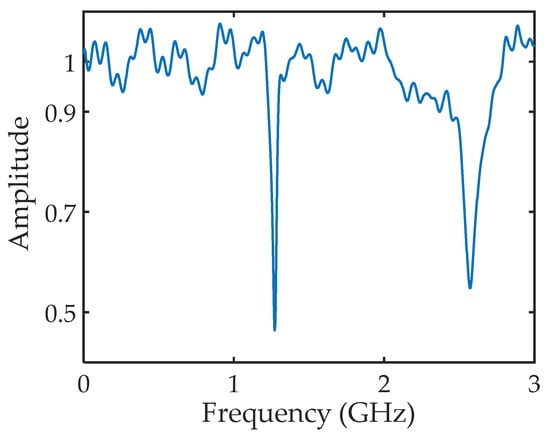 The recorded amplitude reflection spectrum of the prototype sensor under a cavity length setting of 11.8 cm is plotted in Figure 7. Two resonant dips were obtained, which matches well with the calculated results, as shown in Figure 4b, and the Q-factors of the two dips are calculated to 35 and 23, respectively, indicating that the proposed HCC-FPR concept works. The contrast of the second-order resonant dip in the obtained reflection spectrum is larger than the simulation result (i.e., Figure 4b). The reason is that the loss of the HCC in the experiment is larger than the simulation result (i.e., Figure 2), resulting in a more balanced condition regarding the reflectivities of the two reflectors compared with the theoretical calculations. The small ripples in the reflection spectrum are due to the multiple reflections incurred from Port 1 of the VNA and the SMA to Type N adapter.