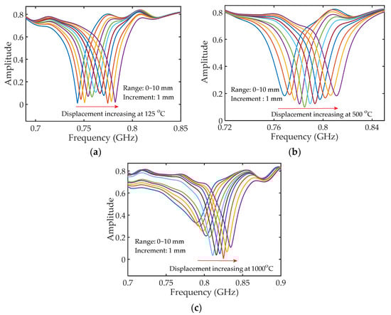 The shift in the resonant spectra of the HCC-FPR displacement sensor as the displacement increased from 0 to 10 mm with a step of 1 mm at three different temperature settings. (a) 125 °C; (b) 500 °C; (c) 1000 °C.