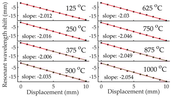 The shift in the resonant wavelength as a function of displacement over a displacement range of 10 mm with a step of 1 mm at eight different temperature settings (125–1000 °C with a step of 125 °C). Linear curve fitting was applied to the test data, and the slopes are indicated in the figure.