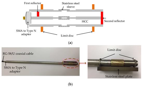 As mentioned above, the HCC-FPR is a resonant device with several resonant frequencies in the amplitude reflection spectrum, and the resonant frequencies are a function of the cavity length of the resonator. In the HCC-FPR displacement sensor design, the idea is to correlate the external displacement to the cavity length of the HCC-FPR. One way is to make the steel sheet (shown in Figure 3) movable. However, we found that movable steel sheet (i.e., the second reflector) had a contact issue with the inner/outer conductors such that the displacement measurement resolution was limited to the thickness of the steel sheet. In order to have a stable and solid physical contact between the steel sheet and the inner/outer conductors, a novel design for the high-temperature HCC-FPR displacement sensor is proposed and shown in Figure 5a–c. Figure 5a shows a schematic drawing of the novel HCC-FPR-based displacement sensor; Figure 5b shows a three-dimensional rendering of the sensor; Figure 5c shows a photograph of the prototype sensor. There are two separate HCC parts. The first reflector is welded to the left HCC part. The second reflector is welded to the right HCC part, which is movable due to the stainless steel sleeve design and is also permanently connected to a measurement handgrip made of stainless steel. When the measurement handgrip is subjected to an external displacement, the right HCC part and the second reflector will also move, leading to a change in the cavity length of the FPR. Thus, the external displacement is directly correlated to the cavity length of the resonator (i.e., the magnitude of the displacement is equal to the magnitude of the cavity length change). The stainless steel tube is designed to regulate the movement direction of the right HCC part and to protect the main body of the HCC-FPR sensor.