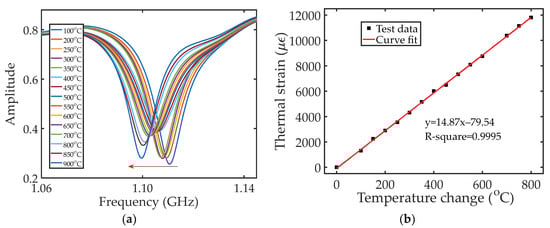 In the thermal strain experiment, the strain sensor was placed in a furnace. The temperature in the furnace was increased from 100 to 900 °C. Figure 11a plots the recorded amplitude reflection spectra of the strain sensor under different temperature settings. As can be observed, as temperature increased, and the spectrum shifted to a lower frequency region, which is expected based on Equation (4). As temperature increases, the thermal strain of the stainless steel plate increases, leading to an increase in the cavity length of the FPR. The measured relationship between the thermal strain and temperature change is plotted in Figure 11b. Curve fitting was applied to the test data, and a linear relationship was revealed, which matches well with Equation (6). The slope, which is the measured CTE of the stainless steel plate, was determined to be 14.87 × 10−6/°C, which matches well with the plate material (stainless steel austenitic 310).