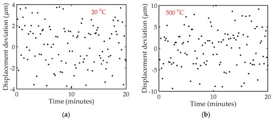 Stability test results at two different temperature settings. (a) Measured displacement deviation at room temperature; (b) Measured displacement deviation at 500 °C.