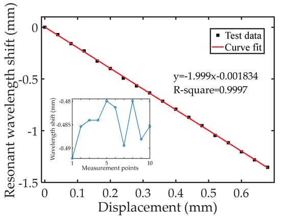 To further demonstrate the measurement accuracy and stability of the proposed displacement sensor, a small range displacement 0–0.680 mm with a step of 0.040 mm was applied to the sensor through a translation stage at room temperature. Figure 13 plots the fundamental resonant wavelength shift as a function of the applied displacement. A linear curve fitting with R-square of 0.9997 indicates a linear relationship between the shift in resonant wavelength and the applied displacement. The slope was found to be −1.999 mm/mm (shift in resonant wavelength/displacement), which agrees well with Equation (5). The inset shows the measured wavelength shift at a displacement setting of 0.240 mm. Ten measured points were recorded. The maximum deviation was calculated to be 12.2 µm, corresponding to a displacement deviation of 6.1 µm, revealing good stability of our sensor.