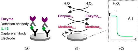 The sensor architecture and signal generation are depicted in Figure 1. The IL-13 sensor was set up in a sandwich format. The capture antibodies were covalently immobilized on carboxyl-functionalized single-walled carbon nanotube (SWCNT) electrodes. These electrodes were chosen due to the ability of covalent immobilization and in order to facilitate fast electron transfer. In the next steps, the antigen IL-13 and the detection antibody were added. A biotinylated detection antibody was applied to enable a streptavidin-horseradish peroxidase (HRP)-based read-out. For signal generation, the established hydrogen peroxide-hydroquinone-HRP system was used [16,27]. The signal generation was started by adding hydrogen peroxide as a substrate for HRP. Due to the distance between the enzyme and the electrode surface, the mediator hydroquinone was required to support the electron transfer to the electrode. By application of a working potential of 0.0 V (Appendix A), a cathodic current (reduction of the oxidized mediator) over time was measurable.