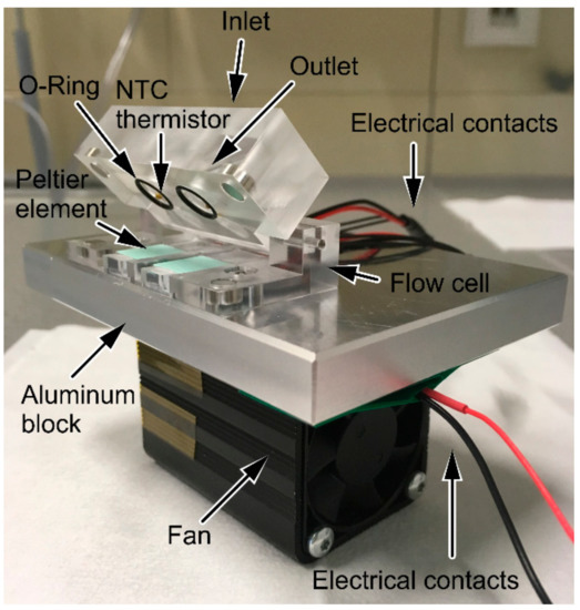 Flow cell for temperature-controlled measurements. Flow cell mounted on aluminum block with fan. Two measurement compartments for dual measurement are available. Temperature control was realized by Peltier elements on the bottom of the cell with thermally conductive pads. In the lid of the cell: inlet, outlet, O-rings, and NTC thermistors. Electrical contacts of the fan and the Peltier elements are shown as well.