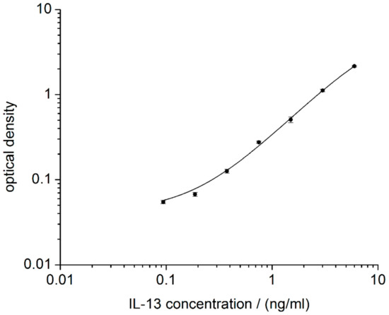 Prior to the development of an IL-13 immunosensor, the immunoreagents form the ELISA kit were checked by performing an ELISA according to the manufacturer’s protocol (2.4). The calibration curve obtained is in line with the manufacturer’s specifications and a LOD of 99 pg/mL was calculated (Figure 3). The assay spanned a dynamic range from 99 pg/mL of IL-13 to 6000 pg/mL of IL-13. Compared with IL-13 concentrations in blood for healthy (20 pg/mL) and for asthmatic patients (120 pg/mL) [33,34], only concentrations for asthmatic patients are within the measurable range of the ELISA. Nevertheless, it was proven that the immunoreagents are suited for IL-13 determination and that they could be the basis for the development of a respective electrochemical immunosensor.