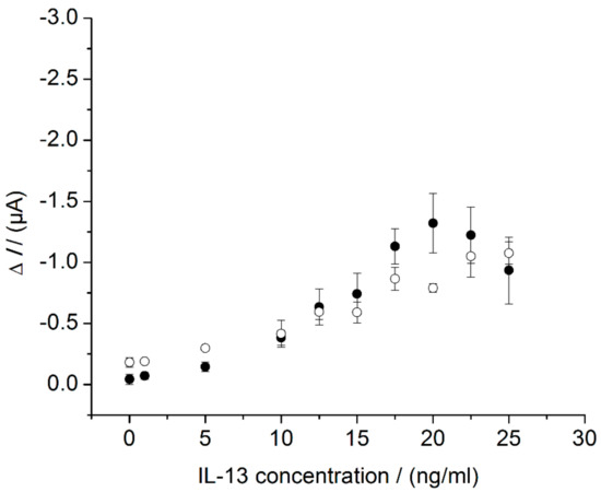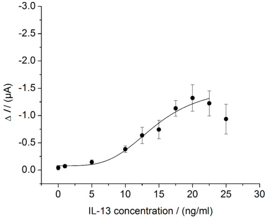 The electrochemical IL-13 immunosensor was set up as described above (Section 2.1 and Section 2.5). For sensor characterization, different IL-13 concentrations were measured according to Section 2.6.1. A sigmoid relationship between the measured current and the IL-13 concentration was found (Figure 4). The maximum sensor signal is reached at 20 ng/mL of IL-13 and decreases for higher concentrations of IL-13 up to 25 ng/mL. A decreasing signal with increasing antigen concentration is well known from one-stage immunoassays, where the antigen and detection antibody are added simultaneously [35]. This so-called Hook-Effect describes the occurrence of false-negative signals in immunoassays caused by an excess of antigen. This effect may also occur in assays where antigen and detection antibody are added sequentially. Here, this phenomenon could be due to incomplete washing after incubation with the antigen [36]. This may be an explanation of the signal decrease at high IL-13 concentrations described in this work. Since the lower concentration range is more relevant for the mentioned application of the sensor, the signal decrease at higher IL-13 concentrations is not crucial.