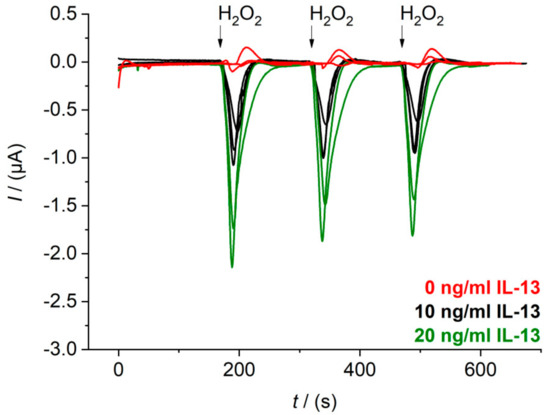 Raw data signals of the electrochemical IL-13 immunosensor measured in the flow cell. Amperometric measurements performed at 0.0 V. Duplicates of sensor with 20 ng/mL of IL-13 (green), triplicates of sensor with 10 ng/mL of IL-13 (black) and with 0.0 ng/mL of IL-13 (red) prepared. Each sensor measured three times in series. Continuous flow of 1 mM hydroquinone in 0.1 M PBS pH 6.0 with 0.8 mL/min, injection flow of 1.5 mM hydrogen peroxide in 0.1 M PBS pH 6 with 0.4 mL/min and injection volume of 100 μL.