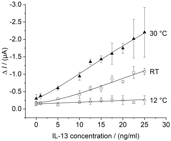 To determine the temperature optimum of the IL-13 immunosensor read-out, the temperature of the flow cell was controlled in the range of 12 °C to 37 °C and a sensor with a concentration of 10 ng/mL IL-13 has been compared to the reference of 0.0 ng/mL IL-13. For sensor preparation, please see Section 2.5 and for amperometric measurements, see Section 2.6.2. At each temperature, the sensor response was recorded twice. The current signal of the sensor with IL-13 increased until 30 °C and then decreased (Figure A5). The current signal of the sensor without IL-13 showed the same trend but with a less pronounced signal increase. The highest current signal at 30 °C corresponds to the temperature optimum of the IL-13 immunosensor or rather to the temperature optimum of HRP [46,47]. The signal decrease at temperatures higher than 30 °C is presumably related to changes in the tertiary structure of HRP, which accords with circular dichroism studies by Chattopadhyay and Mazumdar [48].