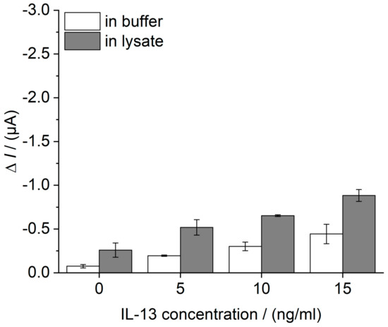 In a first selectivity study, the ability of the developed immunosensor to detect IL-13 concentrations in a complex biological matrix was assessed. Therefore, cell lysate of human lung cancer cell line NCI-H1975, spiked with defined IL-13 concentrations (0–15 ng/mL) was analyzed. For comparison, buffer containing equal IL-13 concentrations was tested. Lysate and immunosensor preparation are described in Section 2.8. As a result, buffer and lysate showed an IL-13 concentration-depended sensor signal (Figure 9). Moreover, a small matrix effect was identified for the lysate.