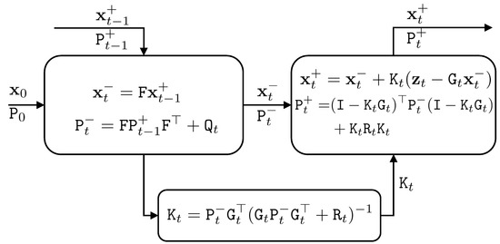 The predicted values are represented by the superscript ‘−’ and the updated values are represented by the superscript ‘+’. Error propagation is applied to estimate the covariance matrix of the current state vector based on the covariance matrix of the state vector in the previous time, such that: